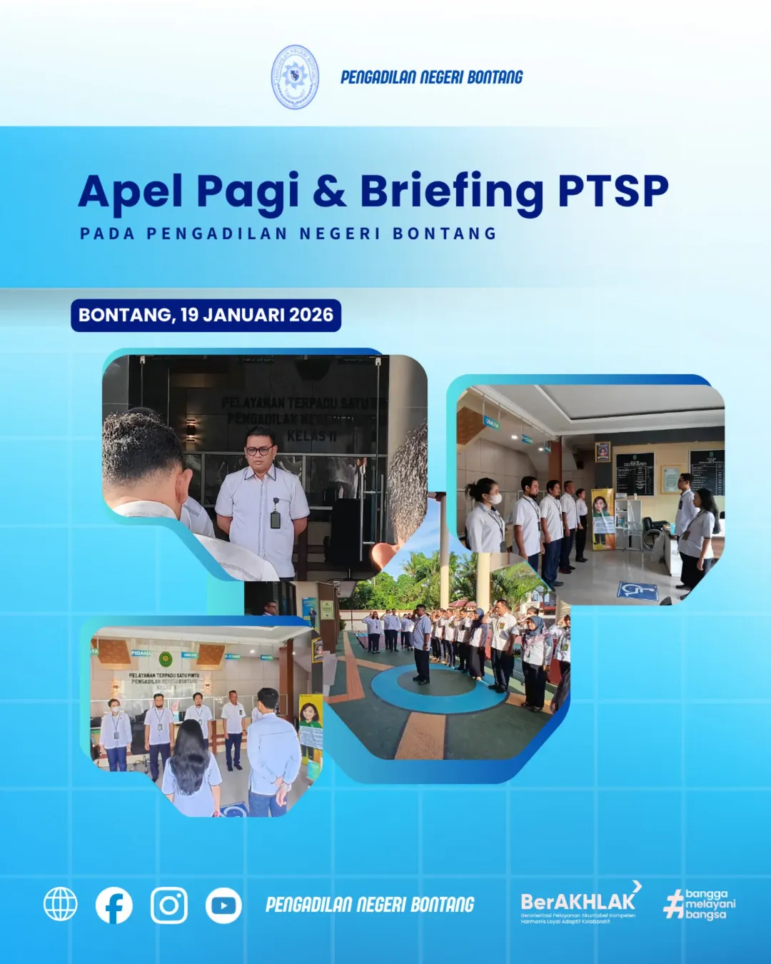 Bontang, 19 Januari 2026 — Pengadilan Negeri Bontang melaksanakan Apel Pagi yang dirangkaikan dengan Briefing Pelayanan Terpadu Satu Pintu (PTSP) sebagai bagian dari upaya peningkatan kedisiplinan aparatur dan kualitas pelayanan publik.