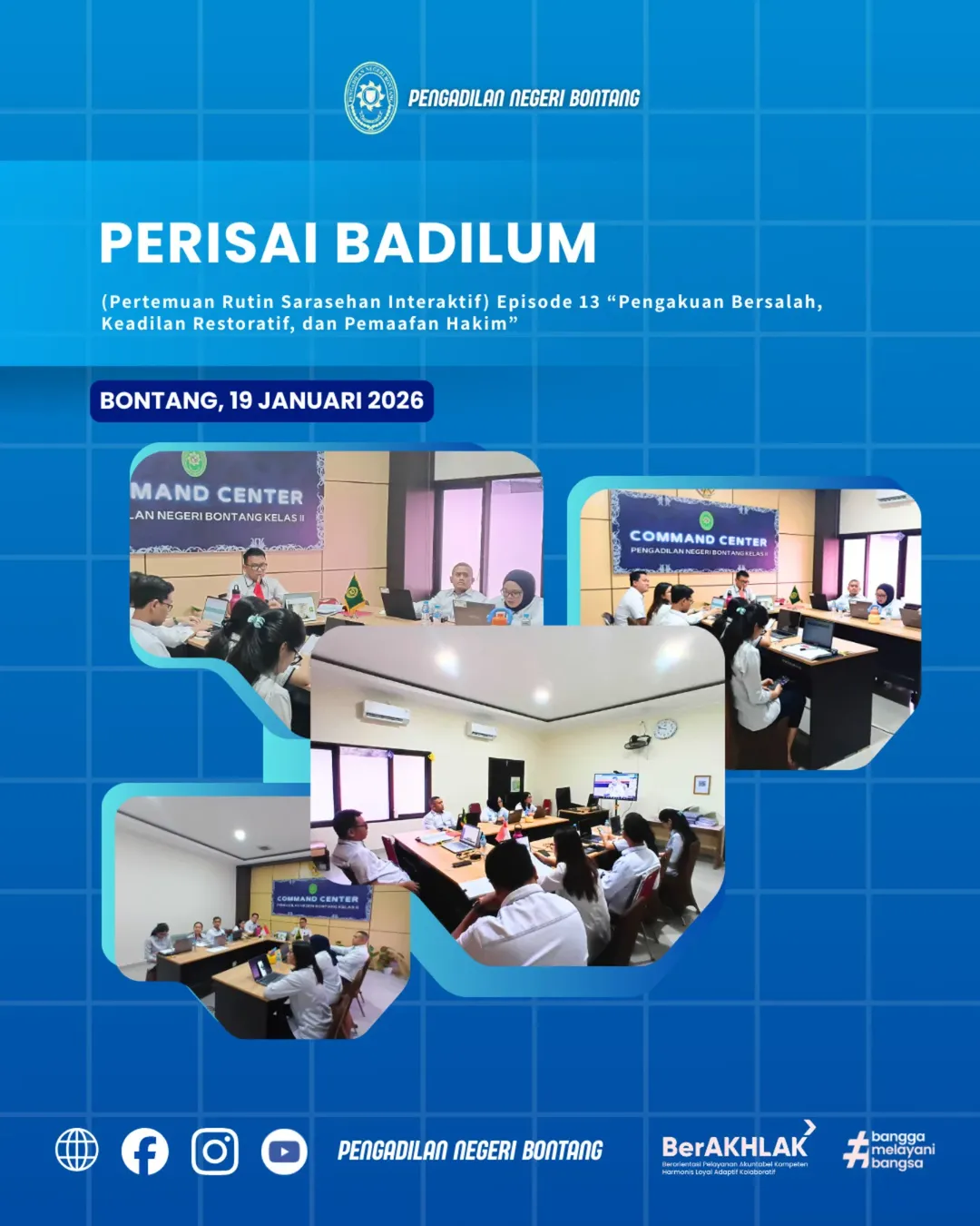 Pengadilan Negeri Bontang mengikuti kegiatan PERISAI BADILUM (Pertemuan Rutin Sarasehan Interaktif) Episode 13 yang diselenggarakan oleh Direktorat Jenderal Badan Peradilan Umum Mahkamah Agung RI, pada Senin, 19 Januari 2026, bertempat di Command Center Pengadilan Negeri Bontang.
