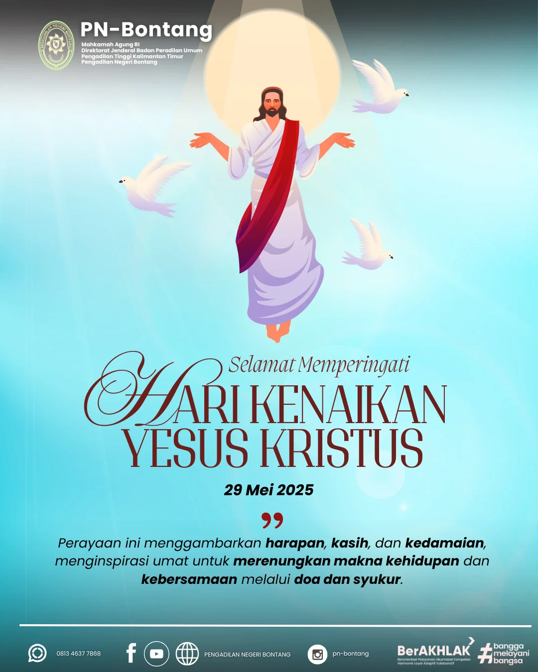 Keluarga Besar Pengadilan Negeri Bontang Kelas II mengucapkan Selamat Memperingati Hari Kenaikan Isa Almasih Tahun 2025 untuk Bapak/Ibu/Sdr/i yang merayakan. Pengadilan Negeri Bontang mengajak seluruh masyarakat untuk merenungkan nilai kasih, harapan, dan kedamaian. Mari wujudkan keadilan dan kebersamaan dalam setiap langkah kehidupan.