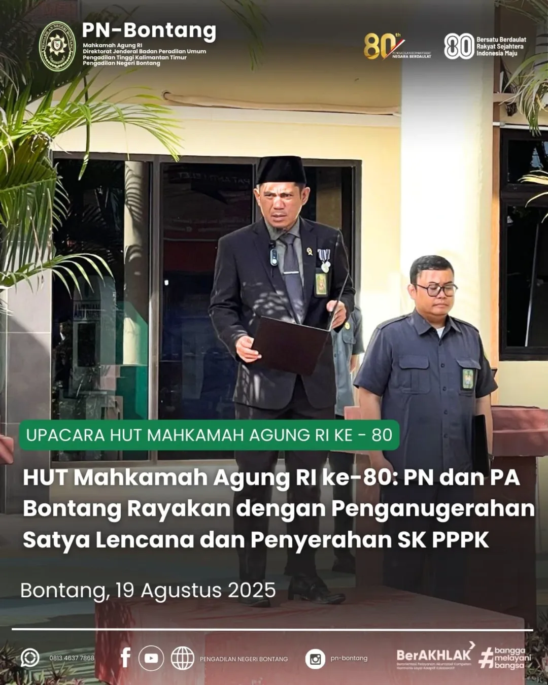 Bontang – Pengadilan Negeri (PN) Bontang menggelar upacara dalam rangka memperingati Hari Ulang Tahun (HUT) Mahkamah Agung Republik Indonesia ke-80, Senin (19/8/2025). Upacara berlangsung khidmat di halaman kantor PN Bontang dengan diikuti oleh jajaran PN Bontang, Pengadilan Agama (PA) Bontang, serta organisasi Dharmayukti Karini Cabang Kota Bontang.