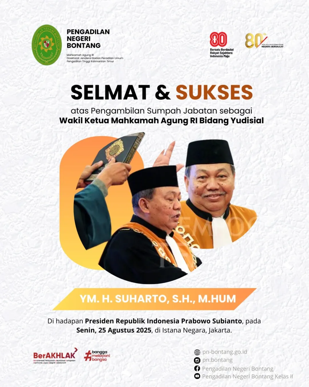 Senin, 25 Agustus 2025, YM. H. Suharto, S.H., M.Hum resmi dilantik sebagai Wakil Ketua Mahkamah Agung Republik Indonesia Bidang Yudisial oleh Presiden RI Prabowo Subianto di Istana Negara, Jakarta.
