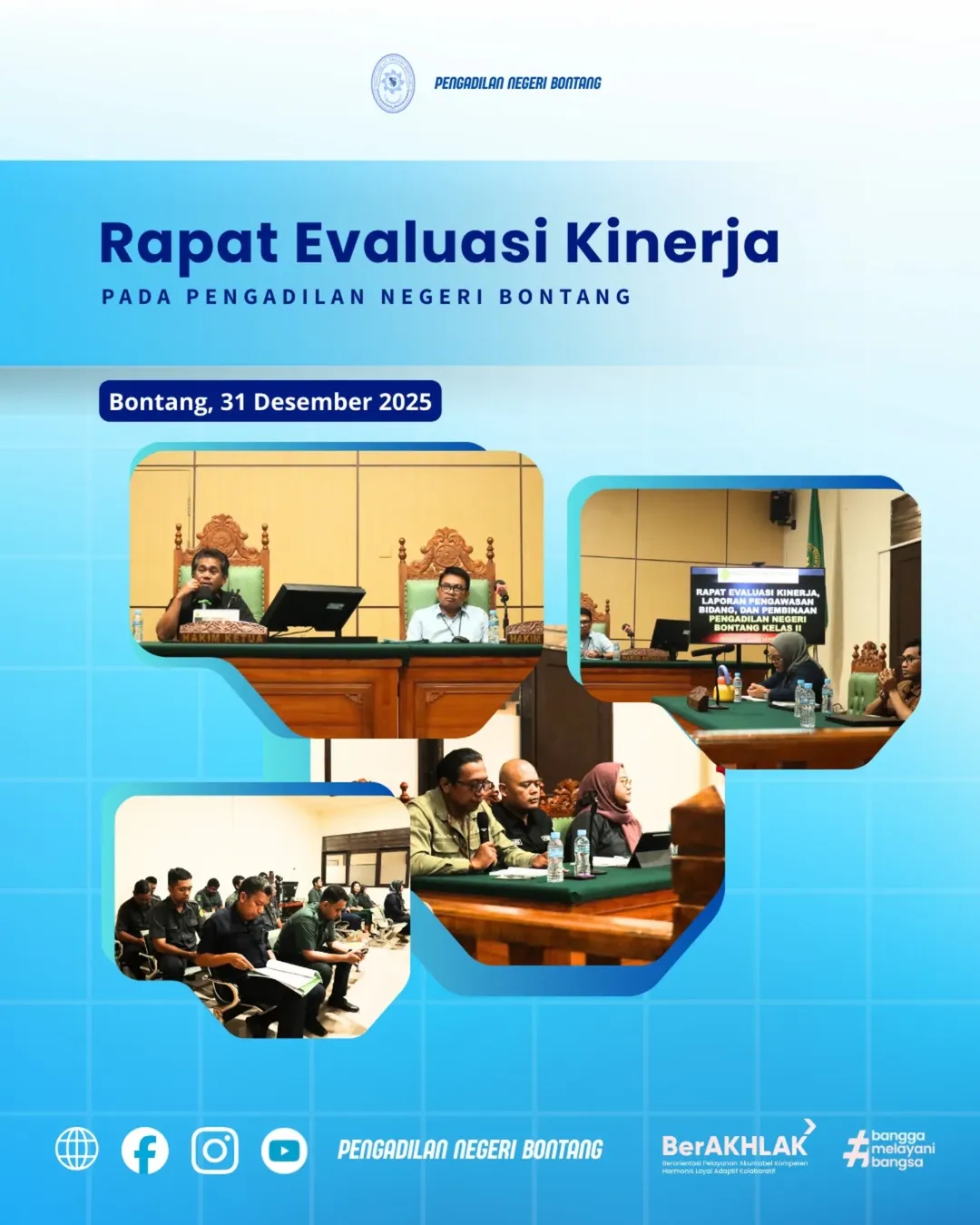 Bontang, 31 Desember 2025 — Pengadilan Negeri Bontang melaksanakan Rapat Evaluasi Kinerja sebagai penutup rangkaian kegiatan tahun 2025. Kegiatan ini berlangsung di ruang sidang Pengadilan Negeri Bontang dan diikuti oleh seluruh aparatur Pengadilan Negeri Bontang.