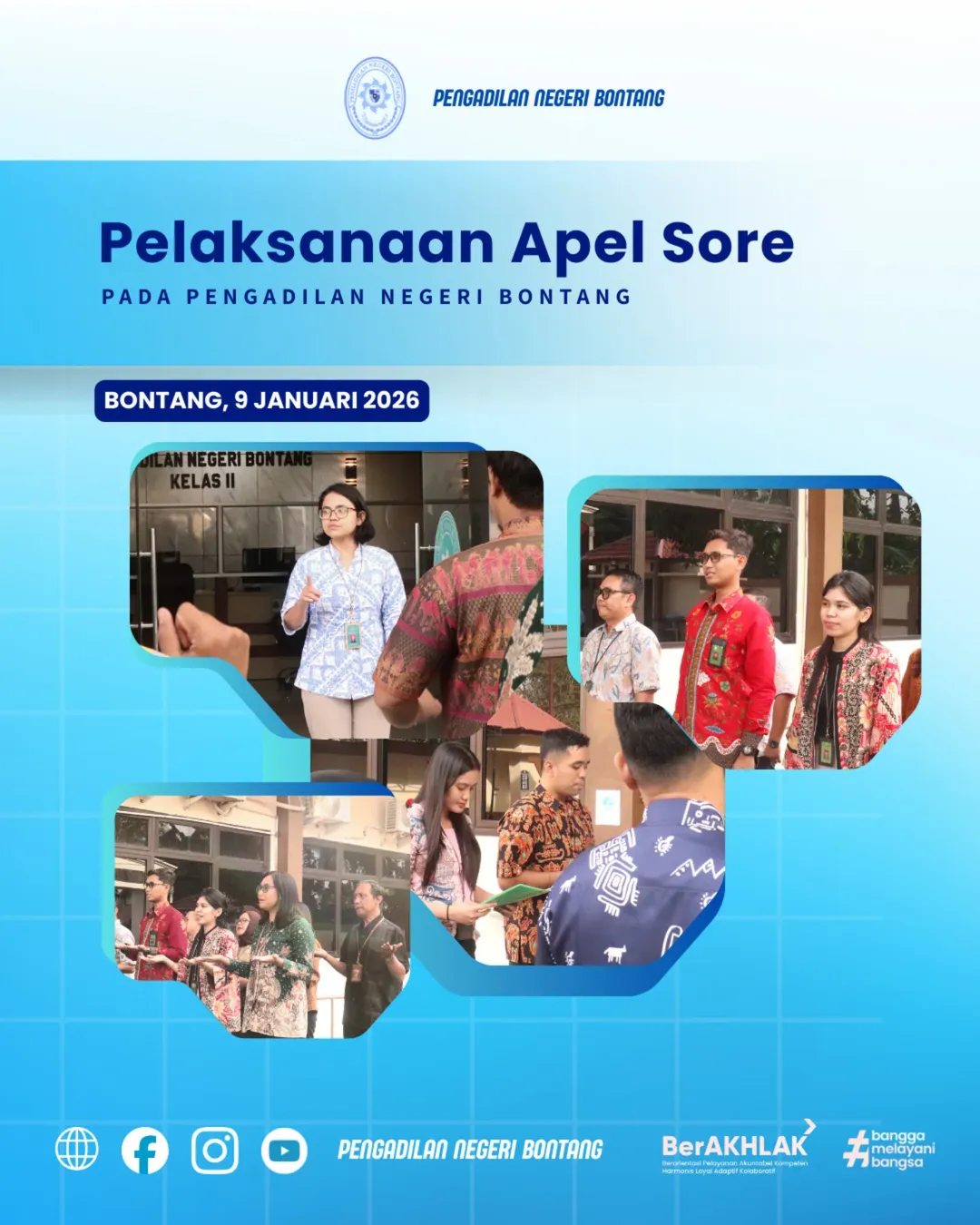 Bontang, 9 Januari 2026 – Pengadilan Negeri Bontang melaksanakan kegiatan Apel Sore yang diikuti oleh seluruh Aparatur Pengadilan Negeri Bontang. Kegiatan ini dilaksanakan sebagai bentuk peneguhan kedisiplinan serta evaluasi pelaksanaan tugas dan tanggung jawab aparatur pengadilan.