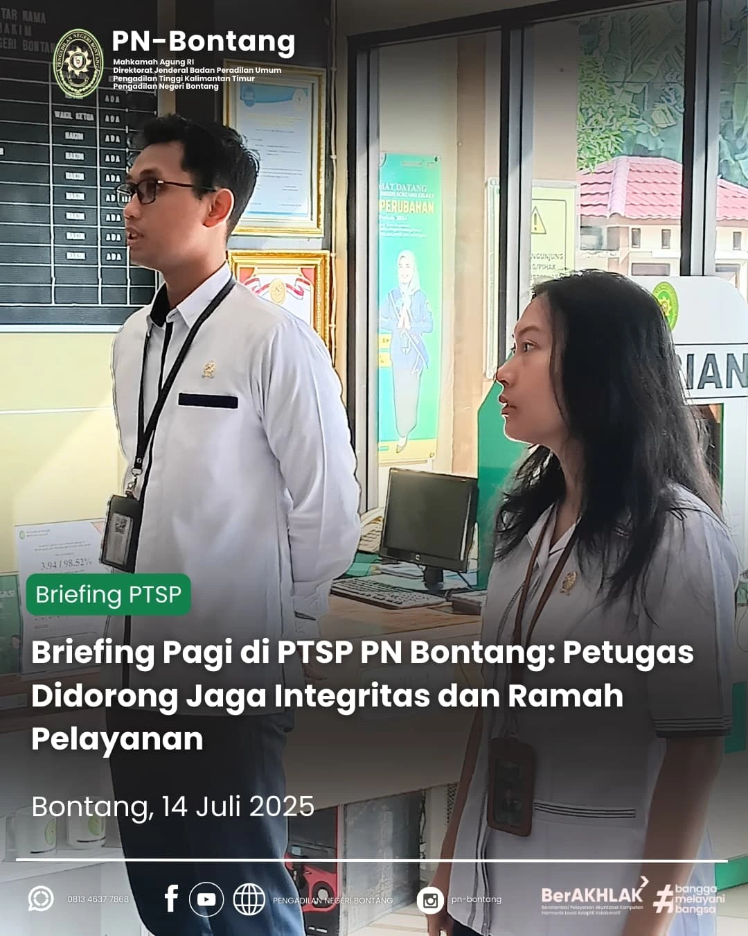 Bontang, 14 Juli 2025 – Pengadilan Negeri Bontang melaksanakan briefing rutin di area Pelayanan Terpadu Satu Pintu (PTSP) pada Senin, 14 Juli 2025. Briefing dipimpin oleh Bapak Denny Ardian Priambodo, S.H. dan Ibu Lavenia Lauri Gricella, S.H.