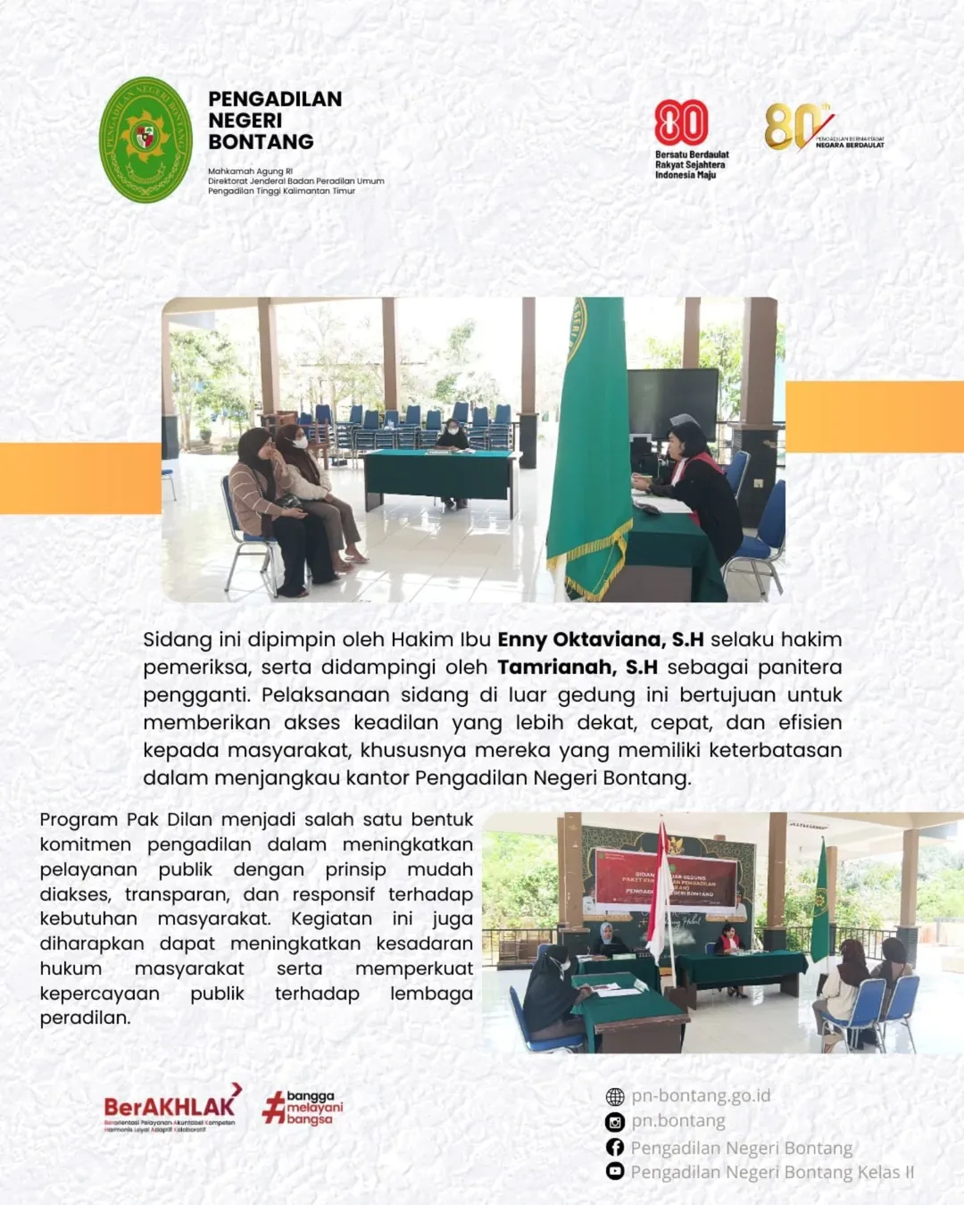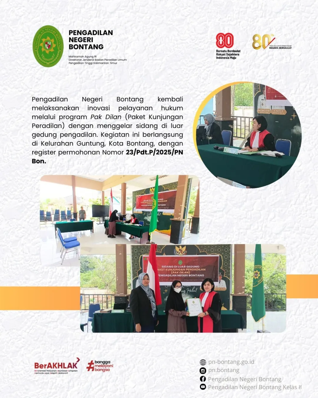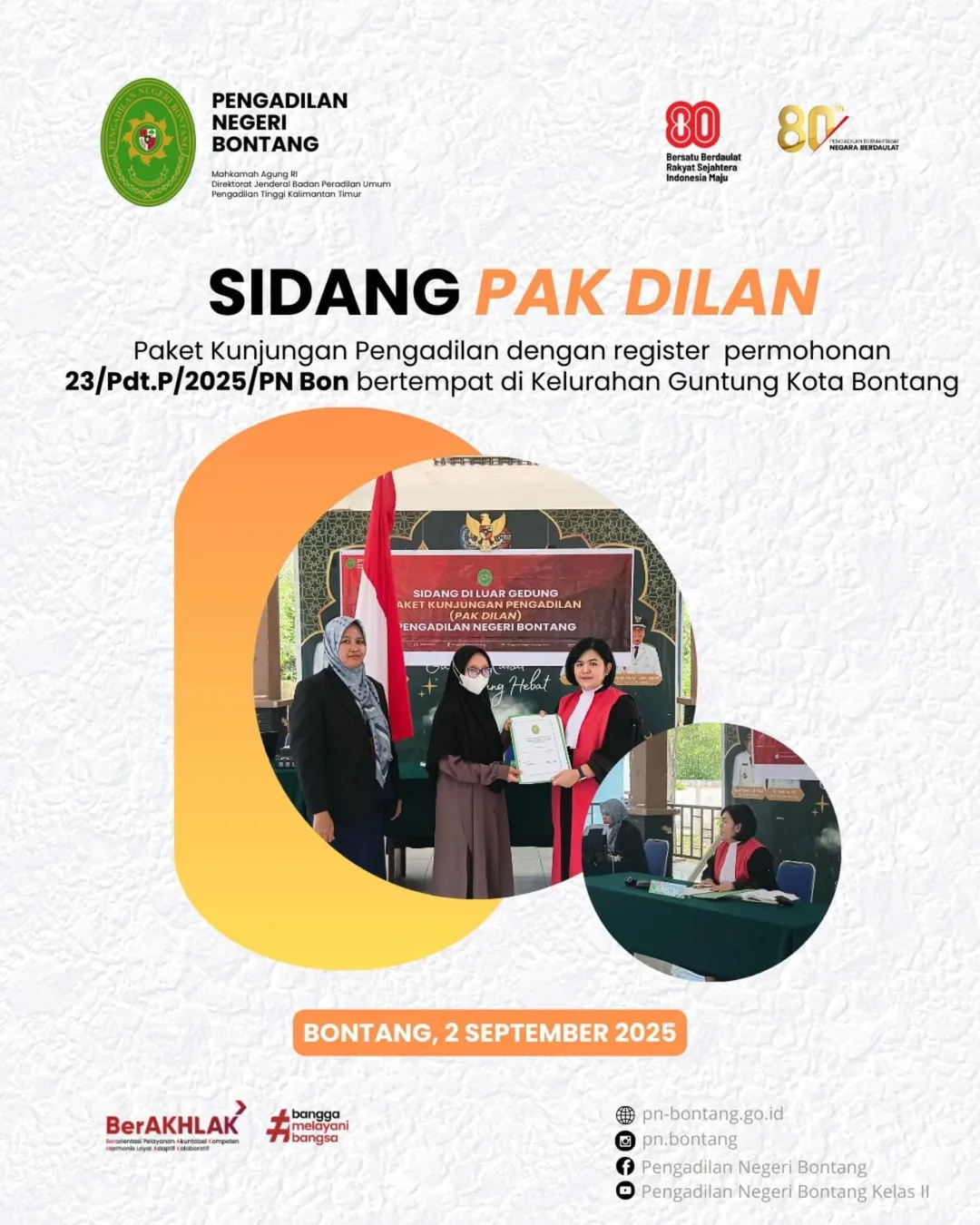 Bontang, 2 September 2025 – Pengadilan Negeri Bontang kembali melaksanakan inovasi pelayanan hukum melalui program Pak Dilan (Paket Kunjungan Peradilan) dengan menggelar sidang di luar gedung pengadilan. Kegiatan ini berlangsung di Kelurahan Guntung, Kota Bontang, dengan register permohonan Nomor 23/Pdt.P/2025/PN Bon.