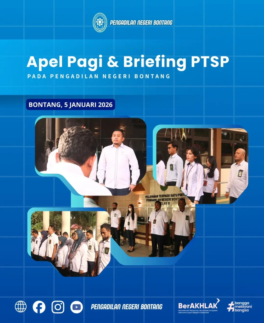 Bontang, 5 Januari 2026 — Pengadilan Negeri Bontang melaksanakan kegiatan Apel Pagi dan Briefing Pelayanan Terpadu Satu Pintu (PTSP) sebagai bagian dari upaya penguatan disiplin, koordinasi, dan peningkatan kualitas pelayanan kepada masyarakat.