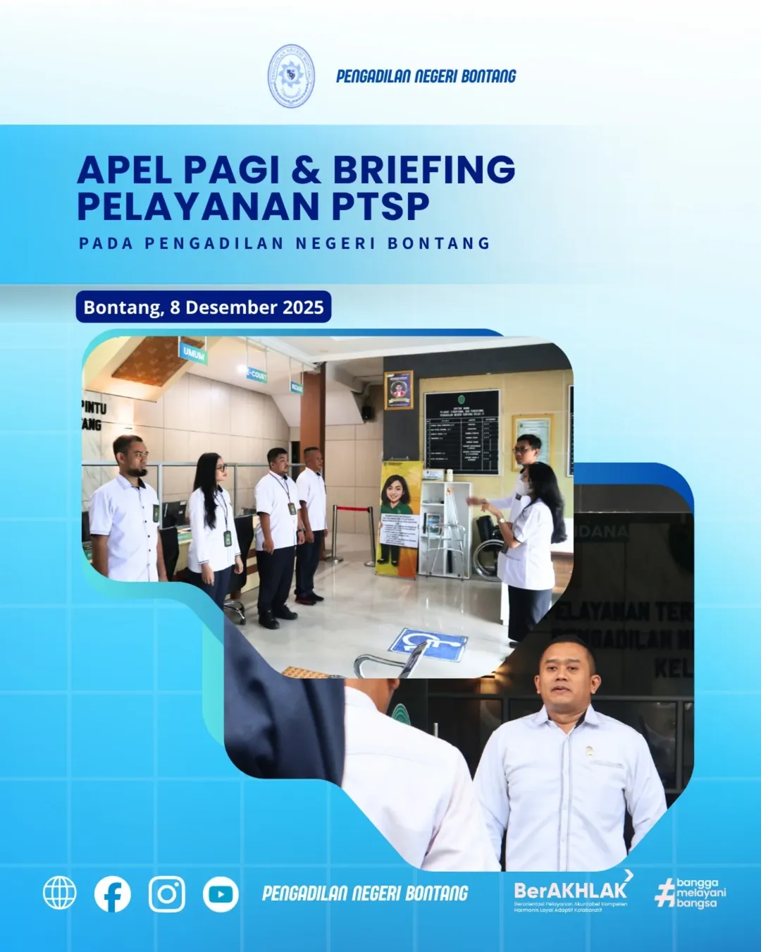Kegiatan ini diikuti oleh petugas PTSP dan aparatur terkait sebagai bagian dari upaya penguatan kedisiplinan, koordinasi, serta peningkatan kualitas pelayanan publik di lingkungan Pengadilan Negeri Bontang. Apel pagi dilaksanakan sebelum dimulainya jam pelayanan guna memastikan kesiapan petugas dalam memberikan layanan kepada masyarakat pencari keadilan.
