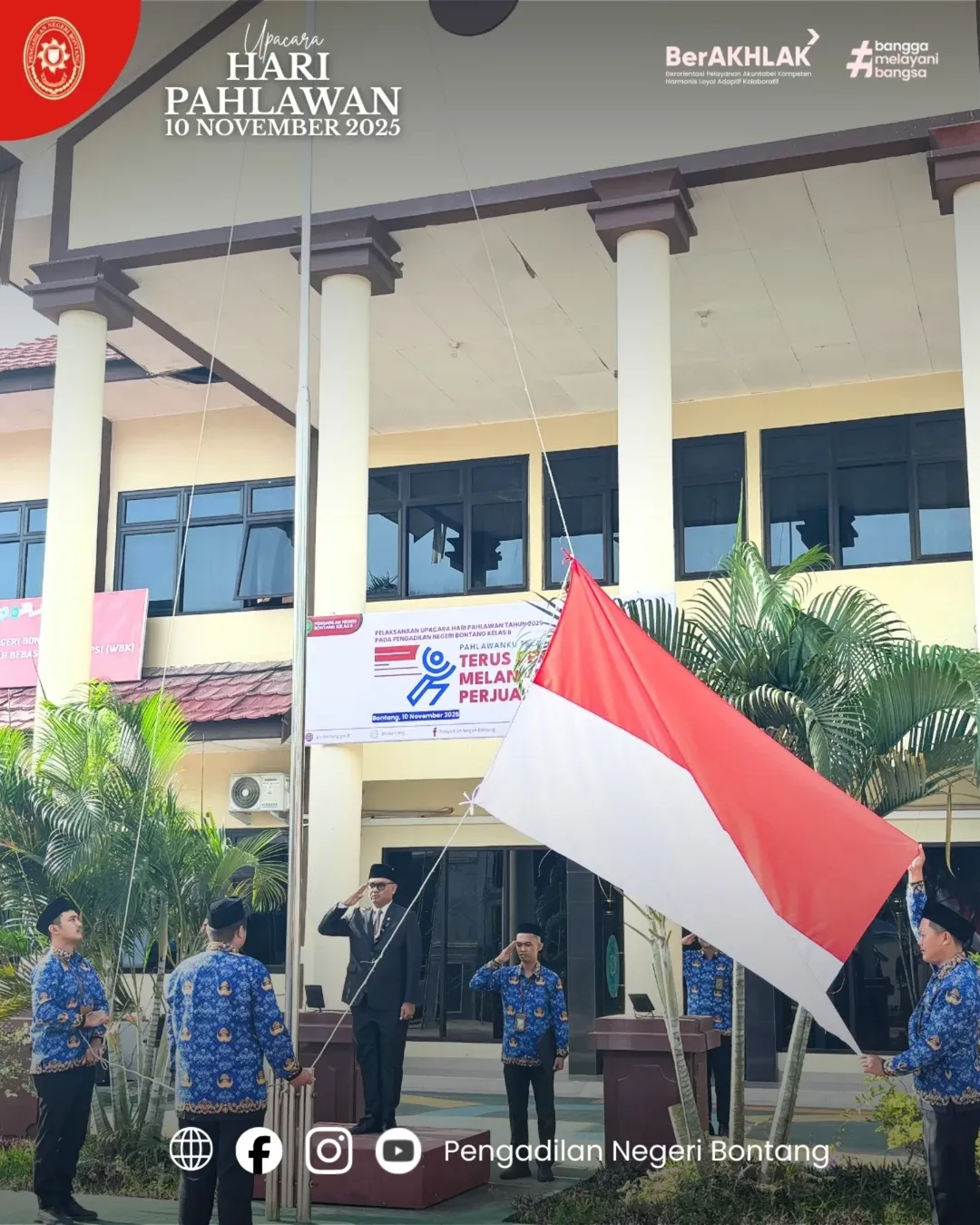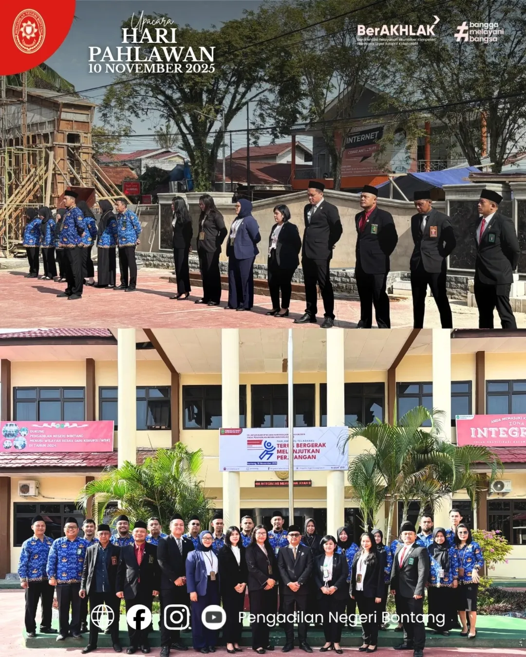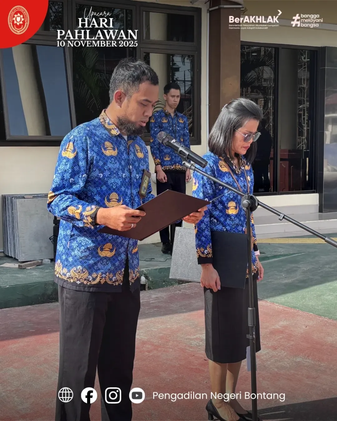 Hari ini, 10 November 2025 seluruh aparatur di Pengadilan Negeri Bontang melaksanakan upacara di halaman kantor sebagai bentuk penghormatan atas jasa para pahlawan bangsa. Acara dipimpin sebagai pembina upacara oleh Maulana Abdillah, S.H., M.H. – Wakil Ketua Pengadilan Negeri Bontang, dan diikuti oleh seluruh aparatur Pengadilan Negeri Bontang.