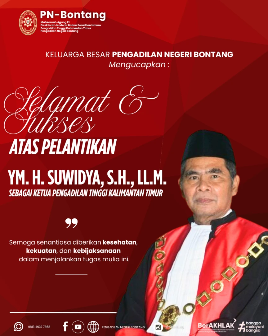 Selamat atas pelantikan Yang Mulia Bapak H. Suwidya, S.H., LL.M. sebagai Ketua Pengadilan Tinggi Kalimantan Timur! 🎉 Semoga kepemimpinan Bapak membawa keadilan yang luhur, integritas yang kokoh, dan pelayanan yang prima bagi masyarakat.