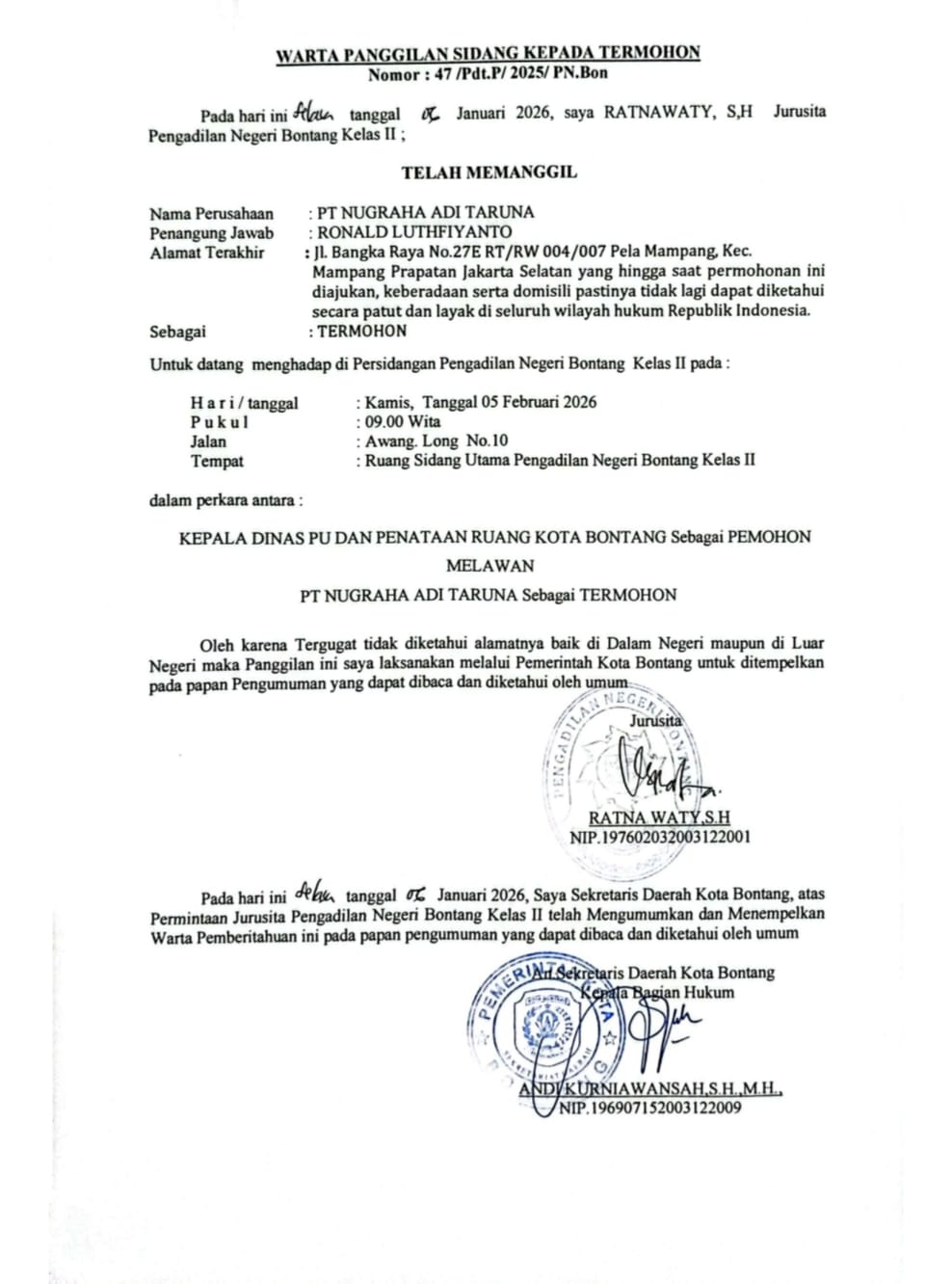 BERITA PANGGILAN SIDANG KEPADA TERMOHON.